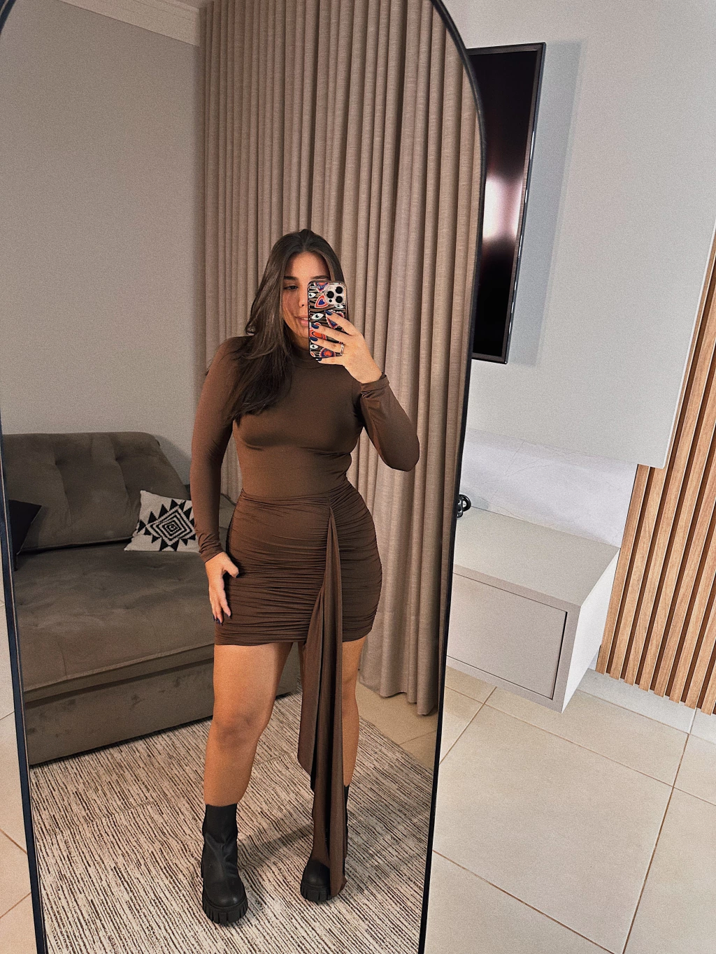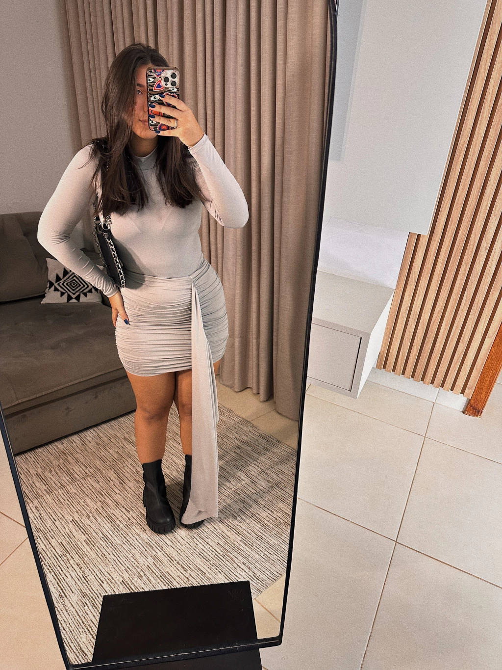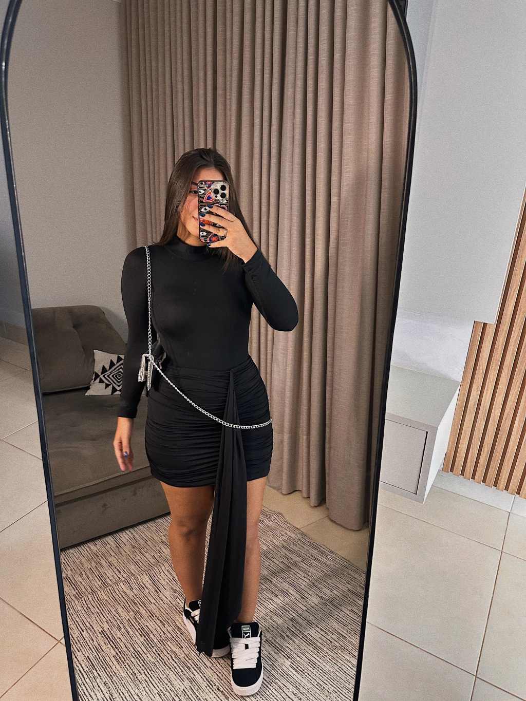 Acompanhado de uma saia drapeada com detalhe em caimento, ele valoriza a silhueta e entrega um visual poderoso — perfeito para quem ama ousar com elegância.