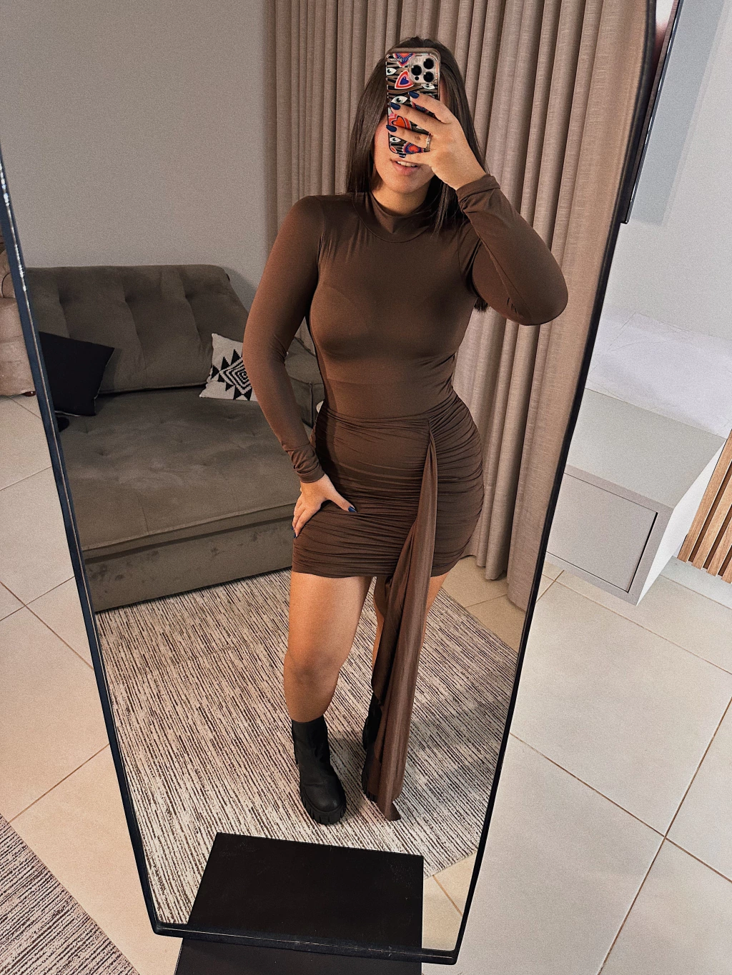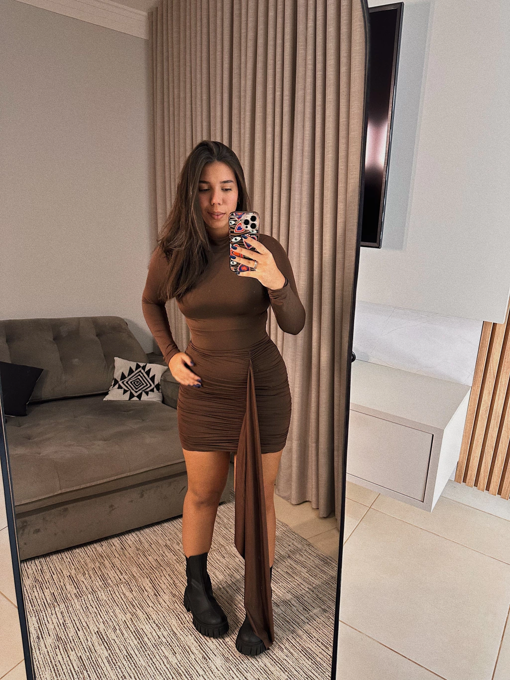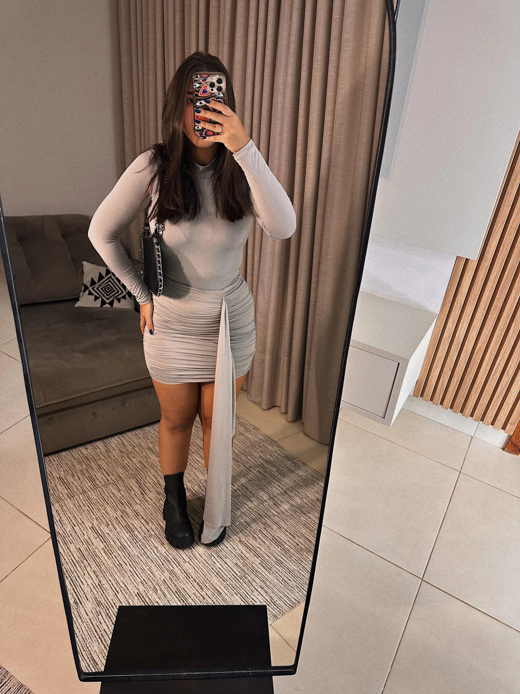 Acompanhado de uma saia drapeada com detalhe em caimento, ele valoriza a silhueta e entrega um visual poderoso — perfeito para quem ama ousar com elegância.