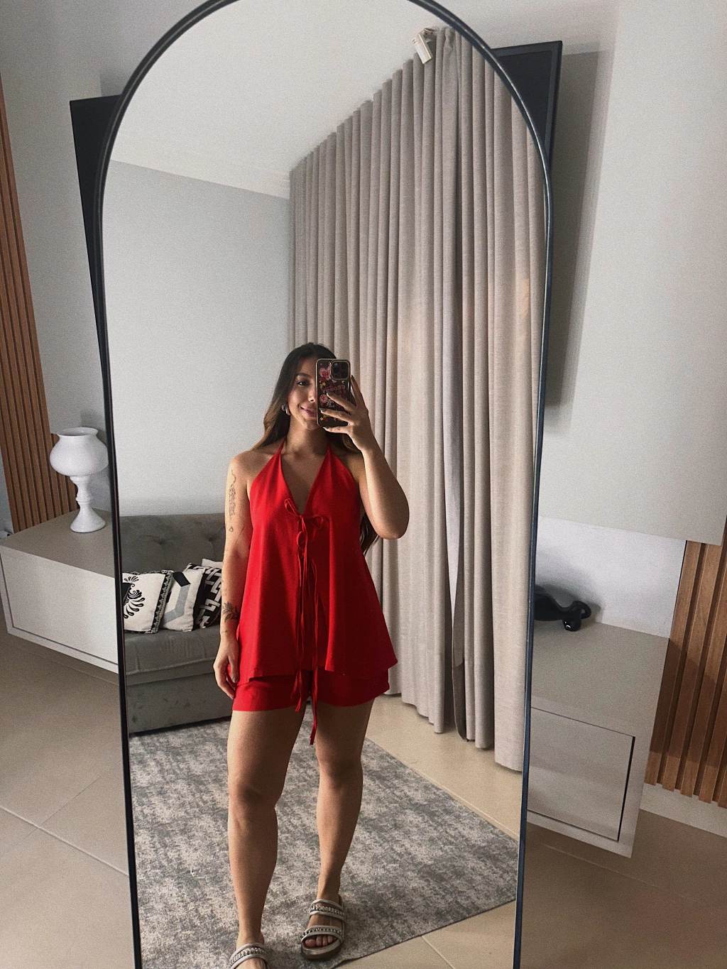Já a blusa soltinha com amarração frontal traz um charme moderno que valoriza o corpo de maneira delicada e estilosa.
