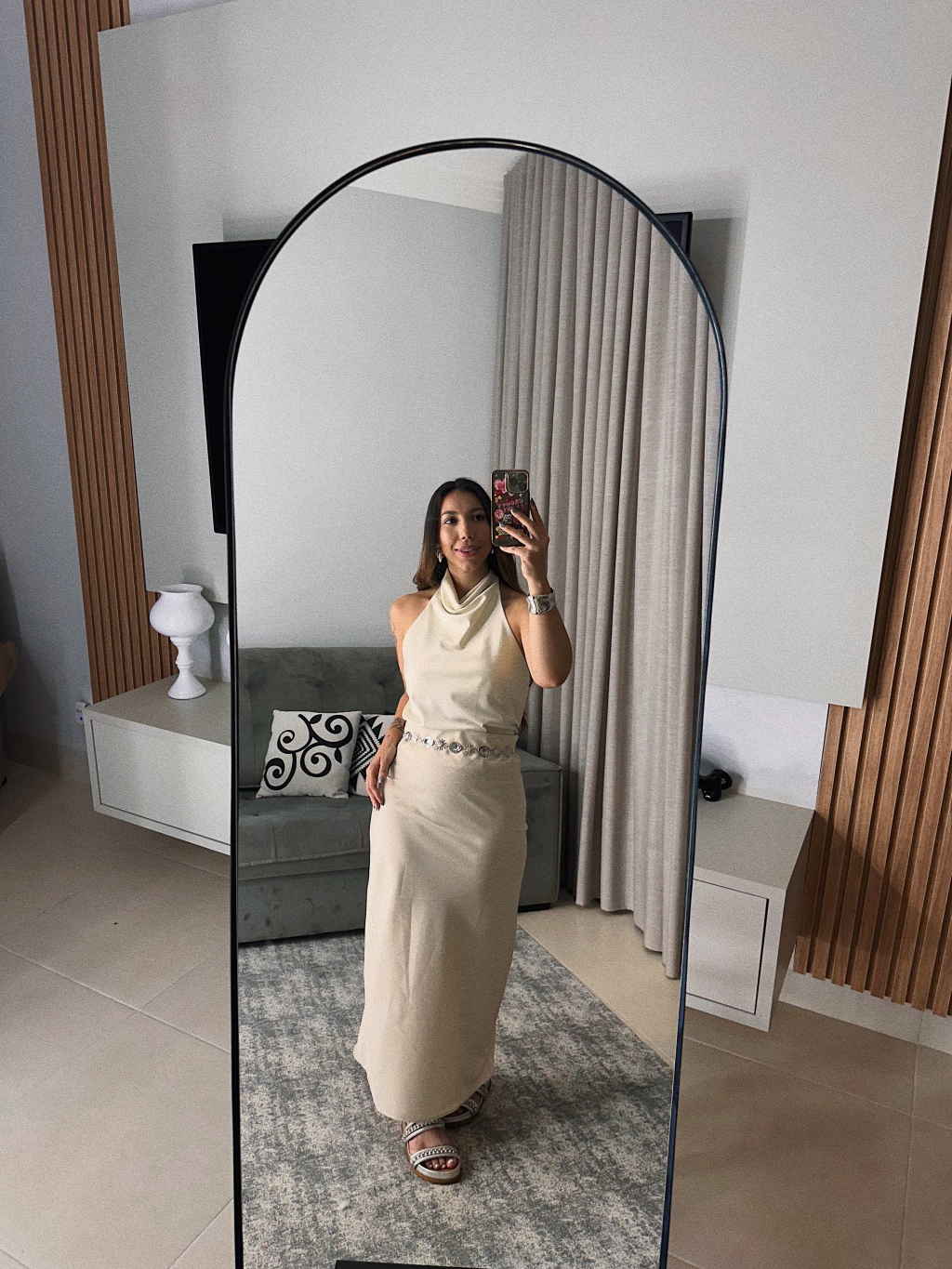 Confeccionada em cetim leve e com brilho sofisticado, ela valoriza a silhueta com movimento fluido e toque macio. O comprimento midi traz modernidade, enquanto o tecido acetinado garante um visual chic para qualquer ocasião, desde looks casuais com camiseta até produções mais refinadas com salto e acessórios.