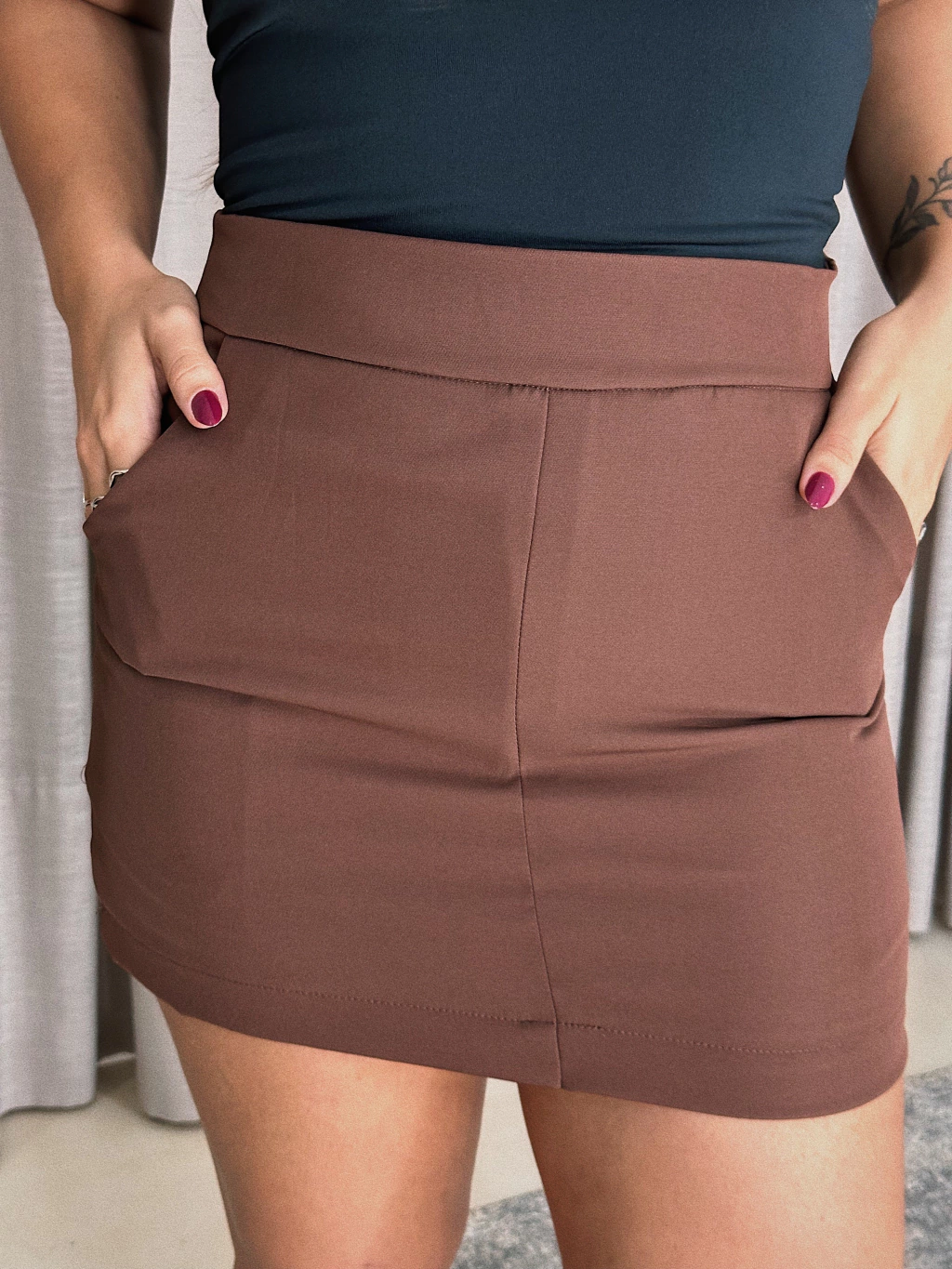 Short saia de alfaiataria com modelagem reta e bolsos funcionais, pensado para quem busca um look elegante e prático ao mesmo tempo.